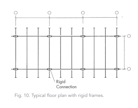 It's best to have well-proportioned bays with shorter span beams to manage building drift. This is one of the challenges of working with a rigid frame system.