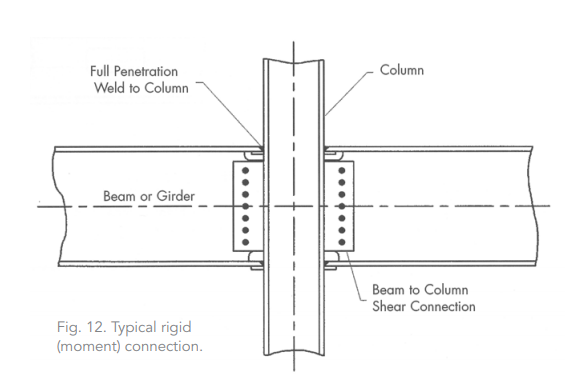 Rigid frame moment connections can be four to six times as expensive as a typical gravity connection because they require more preparation time and field welding. Column stiffener plates are sometimes required, at additional cost, between the flanges of the column to prevent buckling of the column webs.