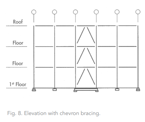 Chevron bracing is a modified brace-frame form that generally allows for doorways or corridors in the center of the bays.