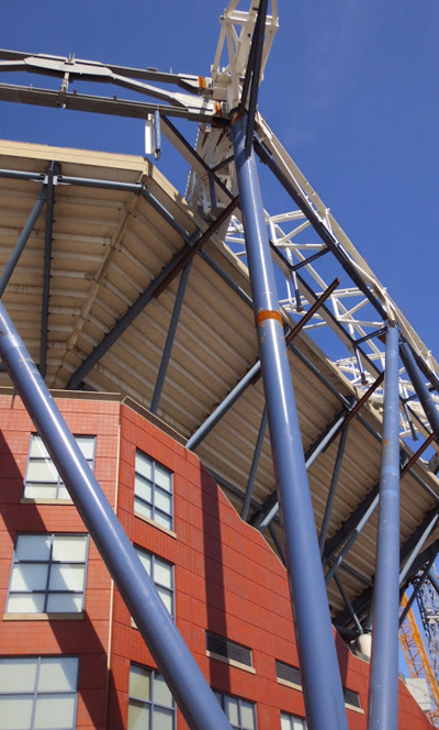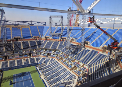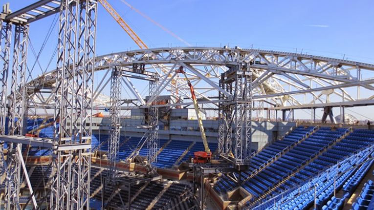AISC’s Mid-Atlantic Regional Engineer, Jacinda Collins, P.E., LEED Green Assoc., recently visited the U.S. Tennis Association Arthur Ashe Stadium in Flushing Meadows–Corona Park, Queens, N.Y., for a tour of the new retractable steel roof being constructed over the stadium. The initial roof frame is expected to be finished by June (in time for this year’s U.S. Open August 31 - September 13). The remaining construction work will resume in the fall, with the retractable portion of the roof to be installed later this year. Twenty-five steel columns will support the roof of the stadium – each 150 ft high, all in blue to match the color of the U.S. Open courts. Several facilities are contributing the fabricated structural steel for the project, including AISC-Member/AISC-Certified fabricators Canam Steel Corporation, PKM Steel Service, Inc., and ADF International, Inc. Derr Steel Erection Co. (an AISC Member/AISC Advanced Certified Steel Erector) is the steel erector for the project. Completion for the project is slated for the 2016 U.S. Open. Click here to view a video of the construction project.