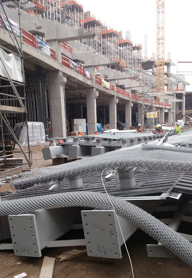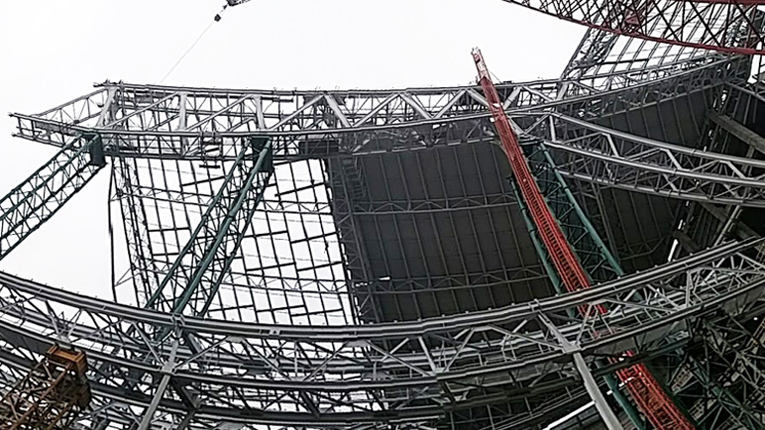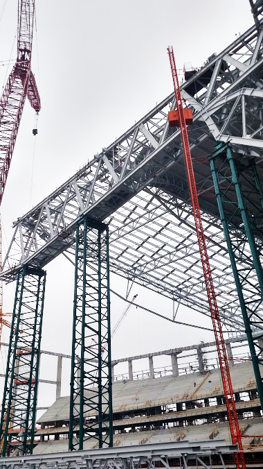 Construction of the new Minnesota Vikings Stadium in Minneapolis has reached halftime. Steel erection for the roof frame is expected to be finished by this fall and the stadium is on schedule to open in August 2016. The project’s steel team comprises AISC Member/Certified fabricator Lejeune Steel Company, Minneapolis, and AISC Member/Advanced Certified steel erector Danny Construction Company, Shakopee, Minn. Mortenson Construction, the project’s general contractor, says crews have erected about 5,000 of the 11,000 tons of steel that will be used for the roof, including five of the 11 queen post trusses that will span from the ridge truss to the ring beam on the east and west sides of the stadium. The ridge truss is close to completion, with two segments remaining to be linked to complete the span of about 1,000 ft. To follow news on the stadium’s construction progress, visit www.vikings.com/news/all-news/stadium.html. (Photos: Brad Lange, AISC's Midwest Business Development Representative)