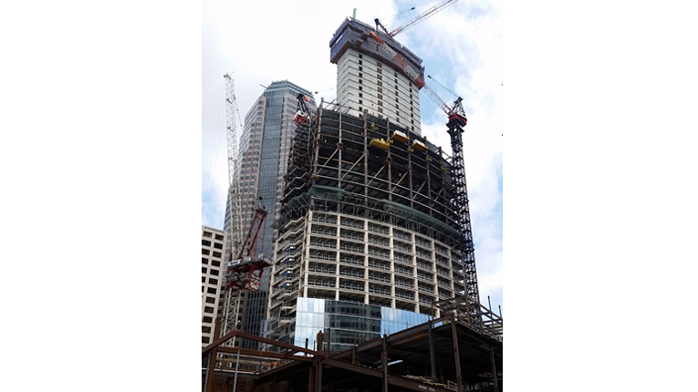 The tower is also built to withstand severe earthquakes. Its gravity system consists of a concrete core wall with steel box columns (called buckling-restrained braces, or BRBs) and structural steel framing outside the footprint of the core. The BRBs serve as overturning resistance and are supported by the core. Forty of them are being used for the lower configuration of the building and span across three stories of office space. Each one weighs more than 23 tons and is rated for 2200 kips. An “electroslag” welding technique was used to weld the BRB gusset plates to the steel plates embedded in the concrete core wall.