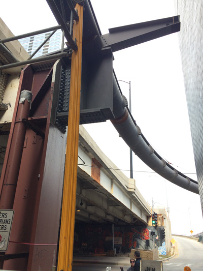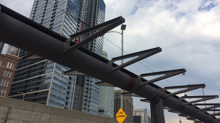 The structure’s steel spine will achieve a smooth and complex horizontal and vertical alignment necessary to clear the existing Lake Shore Drive off-ramp, as well as area structures. The project uses about 500 tons of structural steel, which is being fabricated by Hillsdale Fabricators, St. Louis (an AISC Member/Certified fabricator).