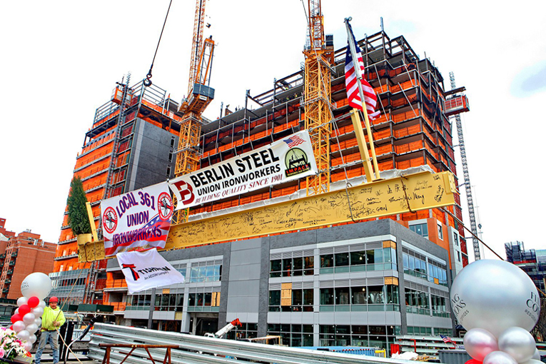 The Flushing Commons megacomplex in Queens, N.Y. finished the first phase of development last month with the topping out of two high-rise buildings, one a 14-story residential tower and the other an 11-story office building. The 1.8-million-sq.-ft project transforms what was a municipal parking lot into a vibrant new mixed-use development, creating around 2,600 construction jobs and 1,900 permanent jobs.