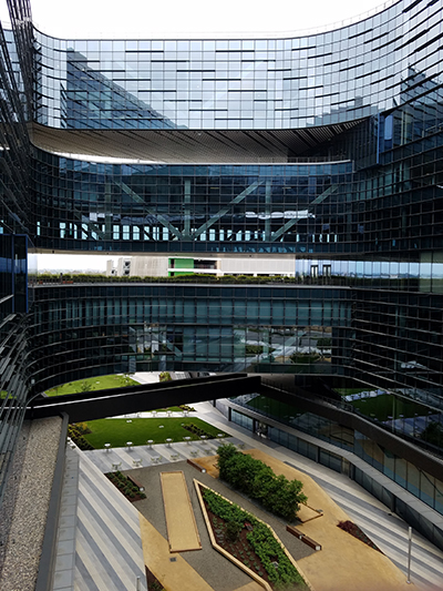 With no perimeter columns on the east and west sides, the 10-story tower appears to float at every third level and offers occupants unobstructed external views. The resulting spaces, and the atriums around them, are dedicated collaboration areas, facilitating casual meetings and breaks from the traditional work spaces.