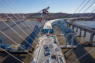 TZC will follow with another connection between the westbound main span and the Rockland approach. Each 95-ft-wide steel section will be connected to the main span towers with six stay cables, which will be anchored and tensioned. TZC will also install precast concrete deck panels on the steel sections to provide a base driving surface.
