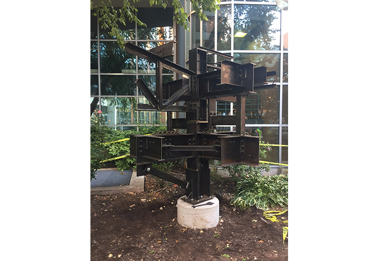 The sculpture was donated by Joe Messner, president and CEO of JGM Fabricators, Coatesville, Pa. (an AISC member and certified fabricator) to Drexel’s Department of Civil, Architectural and Environmental Engineering, and installed outside of the Bossone Research Enterprise Center. It will be used for instruction in courses including "Structural Steel Design," "Structural Analysis" and "Structural Design I."
