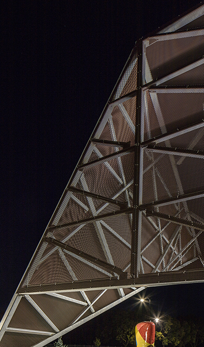 JDAC’s superstructure is comprised primarily of wide-flange steel supported by hollow structural sections (HSS) and wideflange steel columns. Infill framing consists of a combination of wide-flange steel beams and steel joists and HSS frames large window openings and roof monitors as well as forms diagonal braces (HSS5×5) to resist wind and seismic loads. As the steel framing is exposed to view in all locations, order and cleanliness were imperative to the structural design. Several additional steel elements envelop the exterior, including canopies at four locations and two large “scrim” structures. The canopies were designed as cantilevered elements, using pairs of steel channels to create the column and beam, and a custom bent-plate pan system forms the lid. This system is made of ¼-in. sheets bent to a shallow U-shaped panel with a 16-in.-wide base and 2½-in. verticals at each side. These elements are placed side by side to create the lid of each canopy, and the steel was hot-dip galvanized to resist corrosion. All these components connect in interesting ways and are left exposed to create a visually stimulating design that becomes a learning opportunity for the art students.