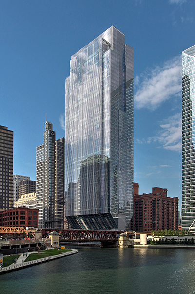 The 54-story, 1.25-million-sq.-ft, Class A office tower has captured national attention, thanks to its elevated perch at the edge of the Chicago River, its span across seven active Amtrak lines and its construction of the largest steel sections in the world. And, most obviously, its shape is unlike anything the city has seen in one of its skyscrapers. The building features a very narrow structure at its base and a compact footprint that gradually extends diagonally to highly efficient, column-free floors above.