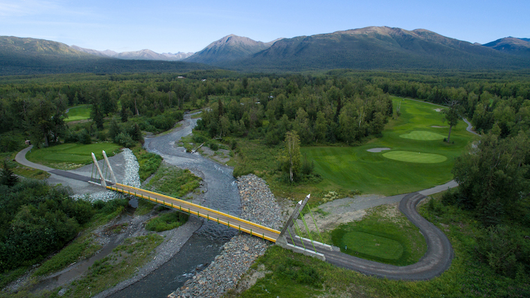 A strikingly beautiful bridge serves as a signature crossing for golfers on the Moose Run Golf Course. The Moose Run Golf Course suspension bridge used a unique approach that saved construction costs while mitigating environmental impacts to the surrounding area. To support the bridge deck, a system of horizontal and vertical cables spans between two vertical towers.