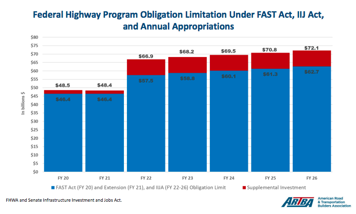 To learn more about the construction funding provided in the new Bill, please see the American Road & Transportation Builders Association's (ARTBA's) summary of the Act’s full contents.