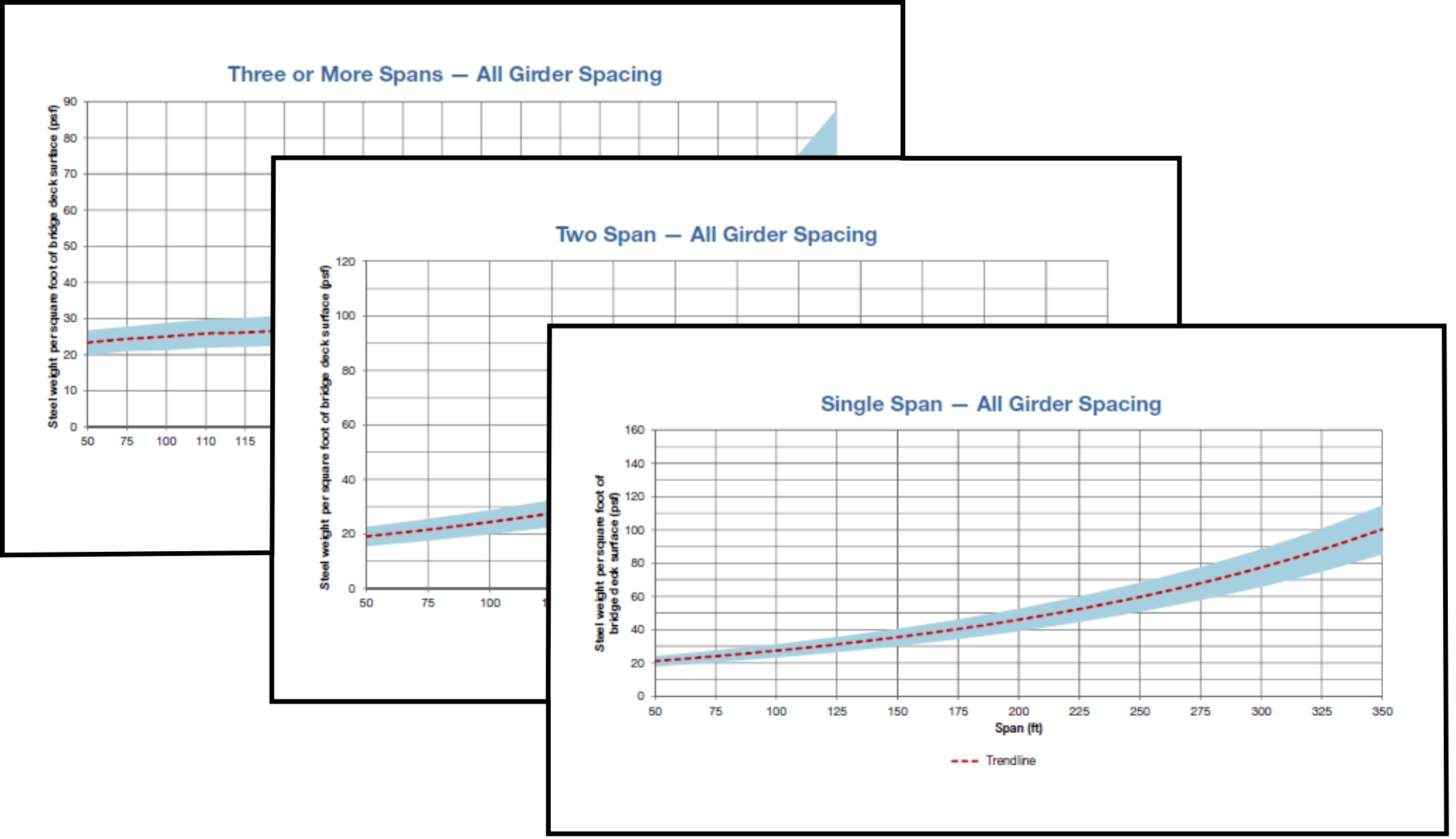 The Steel Span to Weight Curves are the quickest way to determine the weight of steel per square foot of bridge deck for straight, low skew, plate girder bridges. The Curves are organized by span arrangement (1, 2 or 3 or more span bridges) and girder spacings.