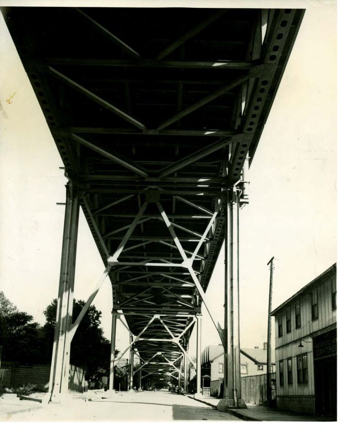 View under the six-span continuous truss, looking away from the river around 1937. The support in the foreground is supporting the ends of the 4-span and 6-span trusses.