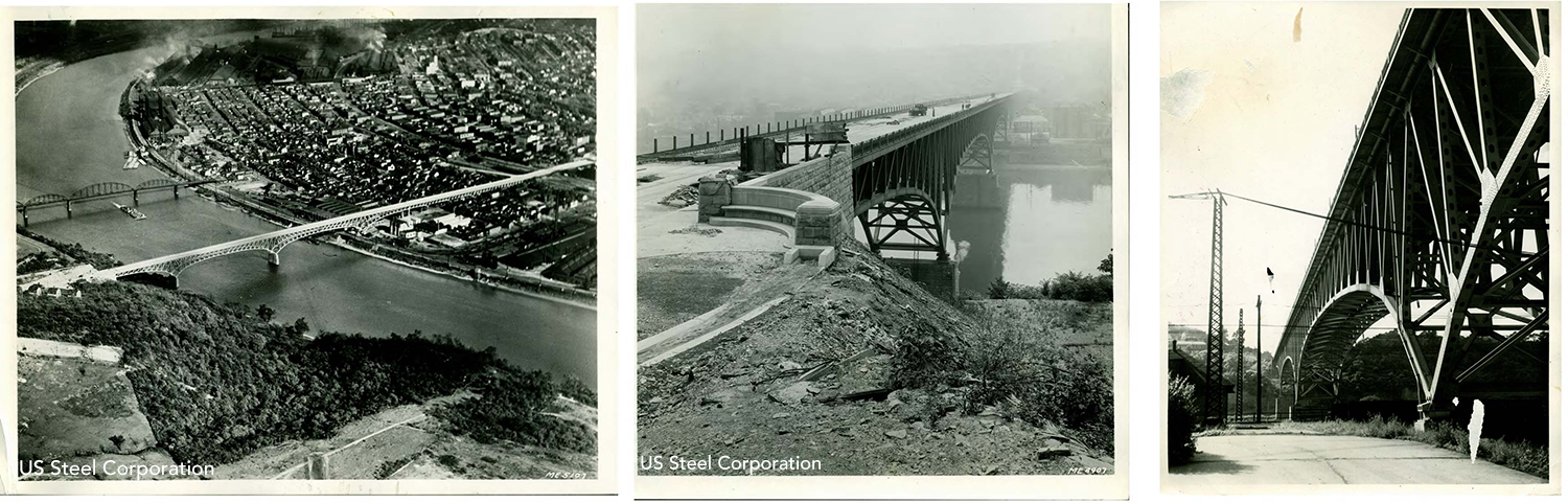 Opened in 1937, this impressive steel superstructure, originally known as the Homestead High-Level Bridge, was designed by Allegheny County with George S. Richardson as chief engineer. American Bridge Company constructed it. The total length of the bridge is approximately 3,100 ft, and it was designed to carry four traffic lanes and a pedestrian walkway on each side. Additionally, the bridge was designed to carry trolley traffic on rails placed in the center two lanes.