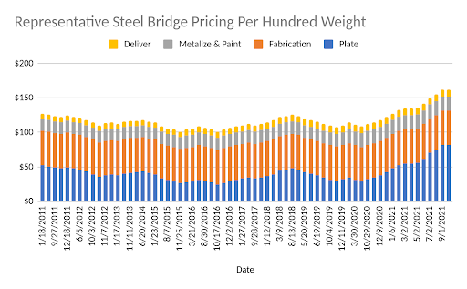 While availability and lead times were the hot topic last fall, today's discussions focus more on the escalated pricing for all raw materials. John O'Quinn, president of High Steel Structures and chair of NSBA's Market Development Committee, is quick to point out that raw material pricing represents only a fraction of the total cost of a bridge. "You can not simply look at the change in plate pricing to fully gauge the cost of a bridge," he explained. "We manage highly impactful variables including labor, materials, coating systems, erection, and even the timing of the project to best deliver bridges at a cost and schedule that meets each owner and project's needs."