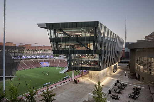 The West Pavilion is the signature element of Nippert Stadium’s recent renovation. The 115,000-sq.-ft, 130-yard-long pavilion wraps the upper west edge of the seating bowl and towers more than 120 ft above the field below. Its dynamic form defines the stadium edge, and a curtain wall with large glass panels facilitates views through and from the structure, showcasing the efficient X-braced structural steel frame that helps to establish the building’s identity.