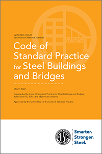 2022 Code of Standard Practice for Steel Buildings and Bridges (ANSI/AISC 303)The AISC Code of Standard Practice provides a framework for a common understanding of the acceptable standards when contracting for structural steel. As such, it is useful for everyone associated with construction in structural steel. Unless specific provisions to the contrary are contained in the contract documents, the existing trade practices that are contained therein are considered to be the standard custom and usage of the industry and are thereby incorporated into a contract between the related parties. |