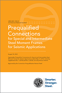 2022 Prequalified Connections for Special and Intermediate Steel Moment Frames for Seismic Applications (ANSI/AISC 358)The prequalified connections standard has been developed by the AISC Connection Prequalification Review Panel in accordance with Chapter K of the Seismic Provisions for Structural Steel Buildings. These connections have been prequalified for use in special and intermediate steel moment frames without the need for additional testing. Dual-units format provides for both U.S. customary and S.I. units. |